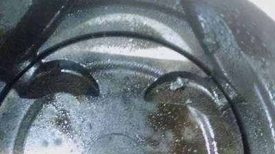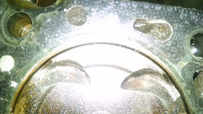 and then found minor damage to the pistons. On the right, it looked like valve contact with the piston. Unfortunately, we couldn't tell if it was old damage (before the last rebuild) or from this. The one on the right was clearer, though. The piston had contacted the head, although that might have been from the fact that the head was warped (.015 in).