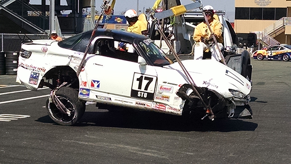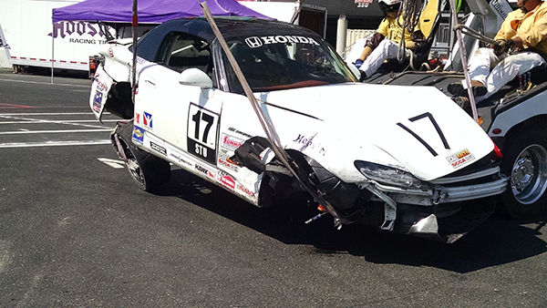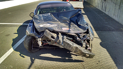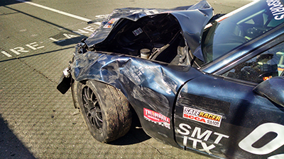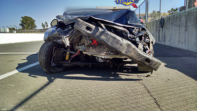 This car will never see the track again. Note, the driver was completely unharmed (except for, perhaps, his vastly deflated ego)