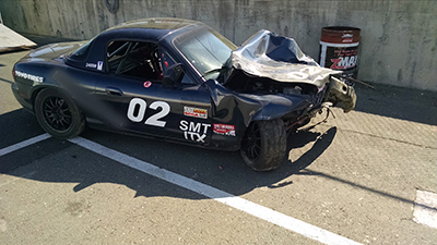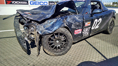 Just like the Majors, I decided to run both Spec Miata and STL. For me it was an uneventful race. But, my mechanic also has a Miata rental business, and one of his renters decided to explore the limits of the car's capabilities vis-a-vis his own skill and ended up driving straight into the tire wall in T8a. Here's how it looked as I was passing him. (video) And, here are some pics I took after it was towed to back to the paddock.