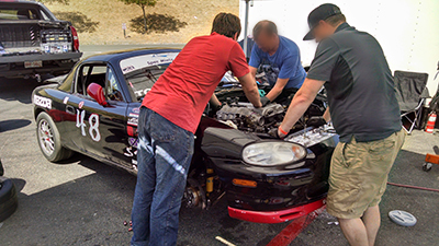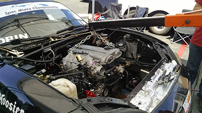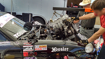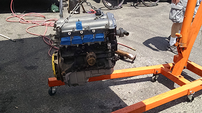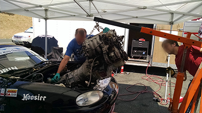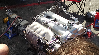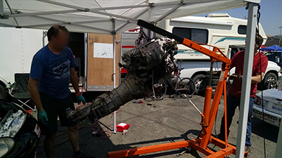 So, he went off to find an engine that he could swap in. HA! Good luck. Turns out, my error. He found an engine that used to belong to one of the best racers at a local shop. So, they brought it down and proceeded to begin the engine swap. I've never witnessed a full engine swap in the paddock before, so I took some pictures of the progress.