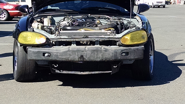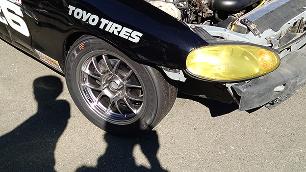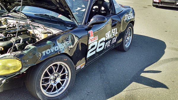 On the first lap of he race, approaching T10, it was me, another Miata (who had gotten in front of Chris), and then Chris. All of a sudden I look in the mirror and see the middle Miata go wide into the dirt. T10 is a very bad place for any sort of trouble, and going off track requires no mistakes be made on reentry unless you want to be on a first name basis with the tire wall. He decided to get to know the tire wall better. (video) Here are some pics of the car.